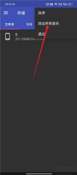2、在菜单里选择“找出所有音乐”选项,以此来查找设备中存储的全部歌曲。