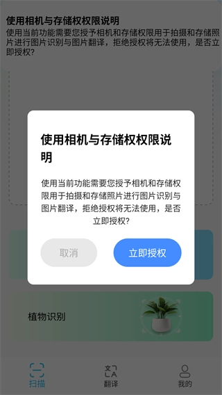 若想使用其他识别功能,需先授权软件获取设备的相机等权限。