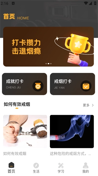 在首页即可看到成就打卡、戒烟打卡等功能;