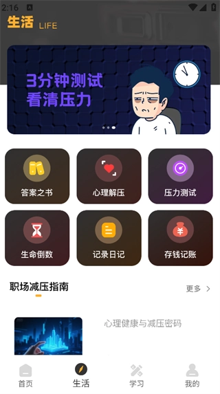 点击页面下方的“生活”选项,就能看到答案之书、心理解压、生命倒数这类功能了。