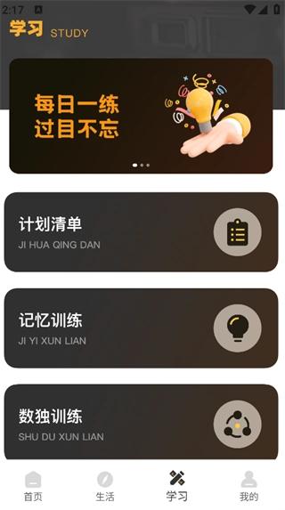 点击页面下方的“学习”按钮,就能查看计划清单、记忆训练、数独训练等功能模块。