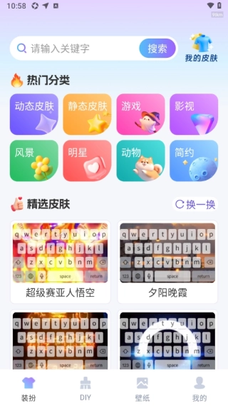 打开软件后,能看到各类热门键盘分类,其中包含动态皮肤,还可选择游戏、影视作品、明星等主题相关的键盘;每日推荐则是依据用户的个人喜好来推送的。