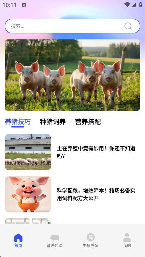 在首页能够了解到养猪技巧、种猪饲养、营养搭配等板块的相关信息。