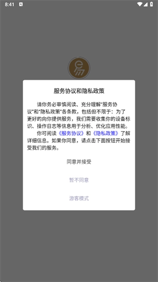 首次使用时,请仔细阅读服务协议与隐私政策,确认无误后点击同意并接受相关条款。