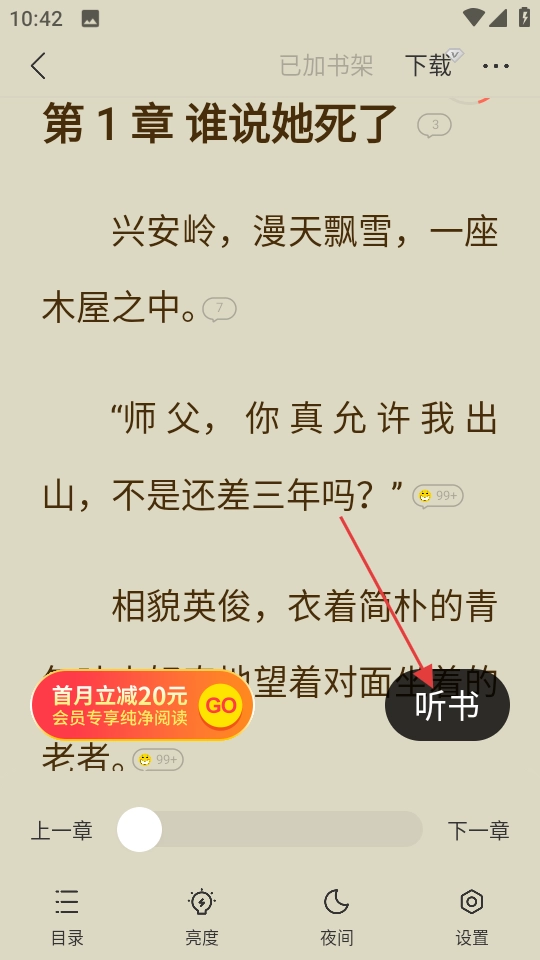 进入小说阅读页面,查看第1章《谁说她死了》的内容,点击后会出现听书按钮。