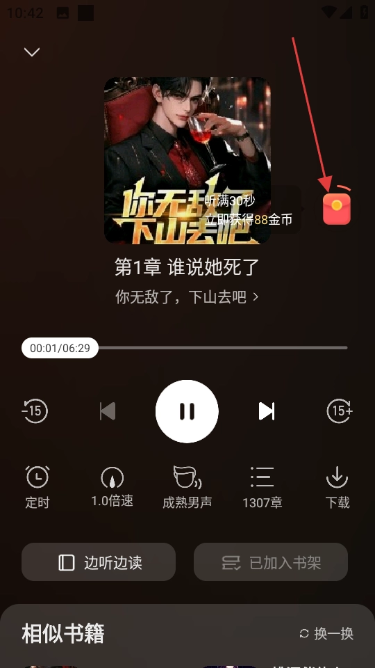 进入听书界面后,就能操作播放、调整倍速等功能来听书,界面旁边还有红包按钮,点击就能赚取奖励。