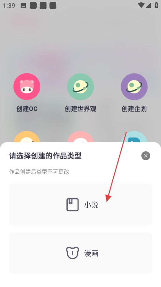 在作品类型选择页点小说,开始写小说。