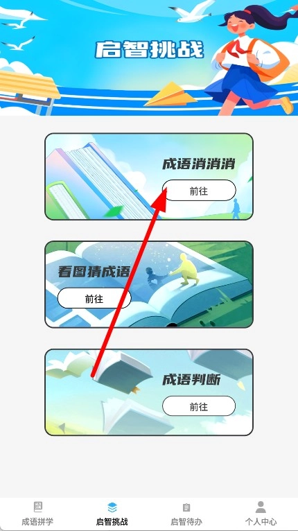 在启智挑战页面,点击成语消消消板块的“前往”按钮,即可进入成语消消消游戏界面。