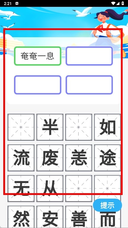 看到下方的汉字方块后,要从这些方块里挑选合适的汉字,把剩下的空格填满,以此完成成语消除的任务。
