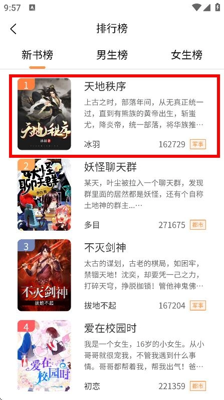 在排行榜页面,点击天地秩序,进入书籍详情页。