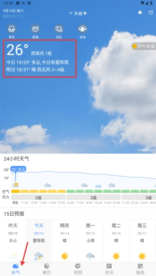 打开综合类应用后,进入天气页面查看东城区的天气状况,能看到当前温度为26°、西南风1级等相关信息。