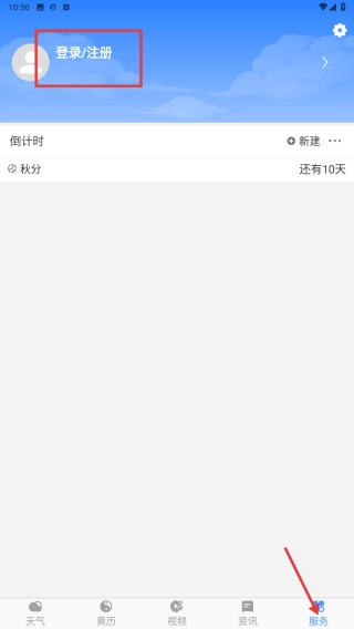 你可以点击页面底部的服务选项,进入服务页面后,找到登录/注册区域并点击,然后进行账号登录或注册的操作。