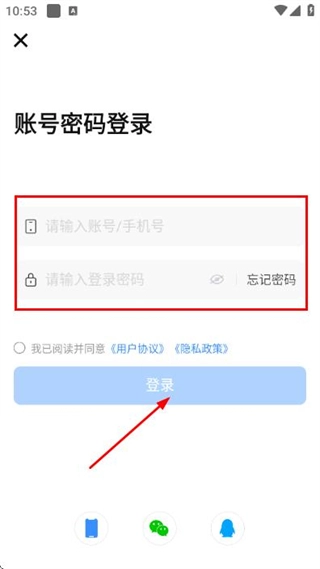 在账号密码登录页面输入账号与密码,勾选相关协议后,点击登录按钮即可完成账号登录流程。
