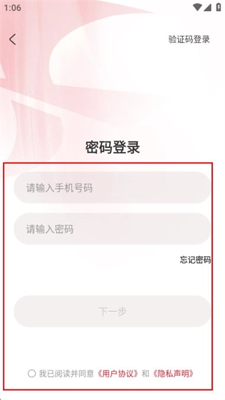 在密码登录界面,输入手机号码与密码,勾选相关协议后点击“下一步”按钮,即可完成登录操作。