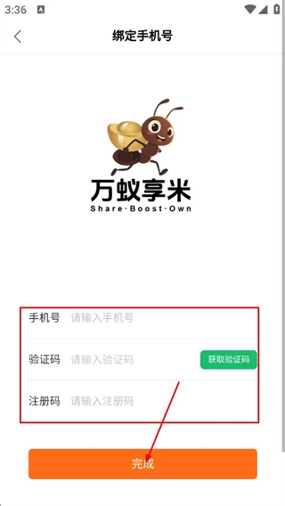 在输入手机号、填写验证码和注册码后,点击“完成”按钮,即可完成账号的注册与绑定操作。
