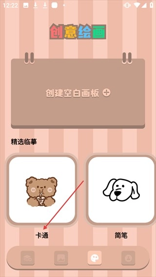 2、进入【创意绘画】界面后,点击【卡通】选项,即可进入卡通图案临摹列表。