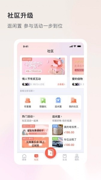 3、能够随时参与社区活动以及热门话题的讨论,知晓邻里之间的动态;还可以查看社区的闲置二手物品信息和周边的生活资讯,及时了解本地的新鲜事情。