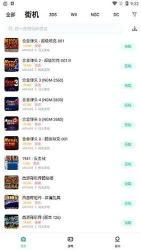 进入游戏界面后,能看到种类丰富的平台游戏,涵盖街机、FC、GBA、MD、3DS、WII、NGC、DC等多个类型。