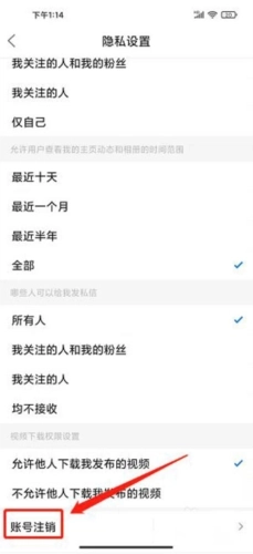 4、进入隐私设置界面,点击【账号注销】