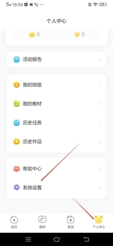 1、进入洪恩学堂后,先点击右下方的【个人中心】,接着点击页面底部的【系统设置】。