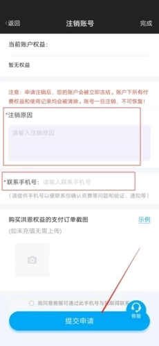 6、最后把【注销原因】和【联系手机号】填写进去,点击【提交申请】,就能顺利完成账号注销操作。