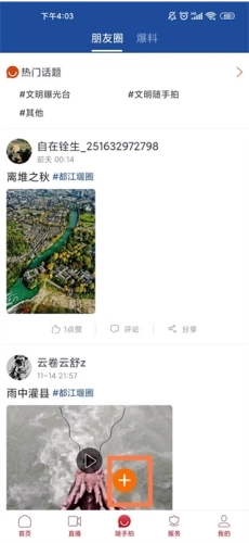 4、进入“随手拍”板块后,能够浏览其他用户发布的视频、文字或图片内容,点击页面下方的加号按钮,还可以发布自己想要分享的话语。