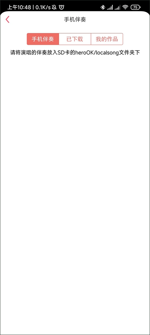 3、这个时候我们还没把伴奏上传到软件内,进入到手机伴奏界面后可以看见提示,让我们将文件放进指定的文件夹内,这个时候就去手机内的文件管理进行移动就可以了。