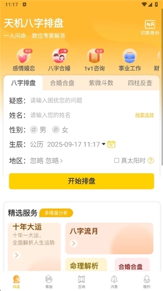 常用的求测界面:具备八字精批、合婚排盘等服务,可按照情感、事业等类别进行快速排盘。