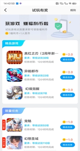 3、在试玩有奖福利中,你可以试玩游戏赚取福利币;