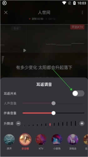 2、在打开的新页面里,点击底部工具栏中的【耳返调音】选项(即下图绿色箭头所指向的位置)