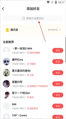 2、进入添加好友页面后,用户借助顶部的搜索框输入好友的酷狗ID号进行搜索,就能找到对应的好友。