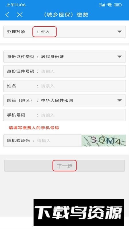 2. 点击【(城乡医疗)缴费】选项后,在【办理对象】栏可选择“本人”或“他人”进行缴费;若为他人办理,需输入缴费人的身份证号、姓名、手机号及验证码,然后点击【下一步】。