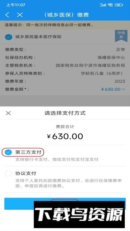 3. 核实确认缴费相关信息后,可通过选择【第三方支付】或者【协议支付】的方式来完成费用的缴纳。