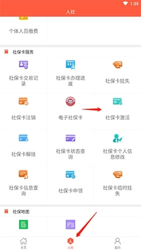 1、打开软件,点击底端的“人社”选项,然后点击“社保卡激活”选项。