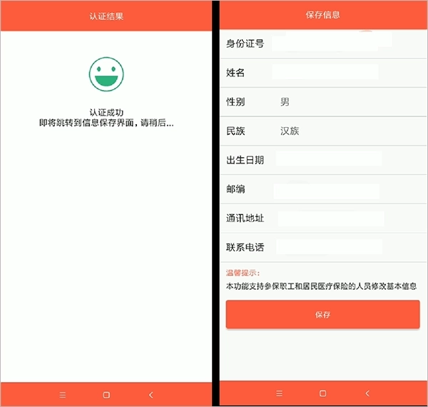 5、成功比对后,会出现“保存信息”的页面,里面的通讯地址和联系电话可以更改,点击“保存”即可。