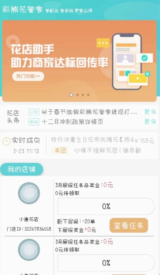 1、打开彩熊花管家应用,其首页展示着各类店铺经营相关的信息,你能够随时查看店铺的各项任务。