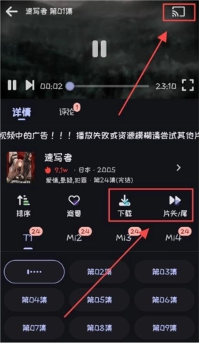3、在播放界面的右上角能看到投屏功能,下方则设有跳过片头片尾的设置选项,大家可根据自身需求进行调整。