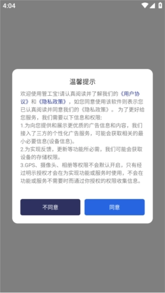 软件启动时需先同意用户协议和隐私政策,之后方可进入使用。