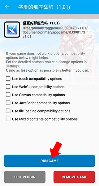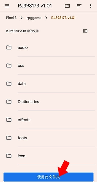 3、找到我们刚才解压好的游戏文件夹,然后点击下方的“使用本目录文件”按钮(要是游戏不是用RPGMakerMV制作的,系统会弹出提示说无法运行)