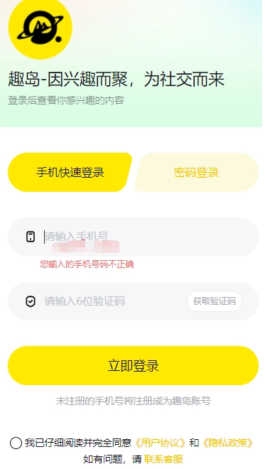 1、打开趣岛交友,进入登录页面。