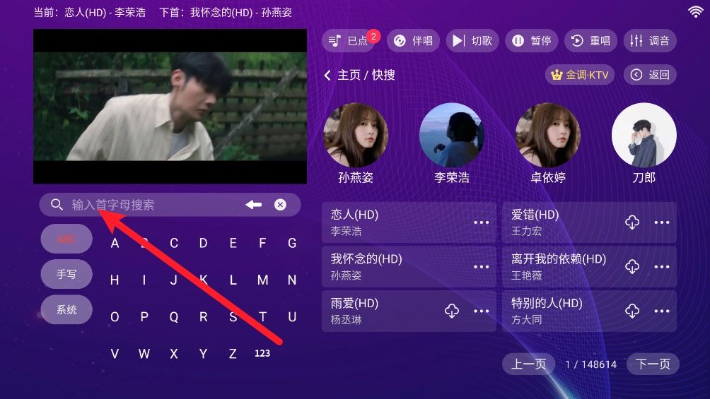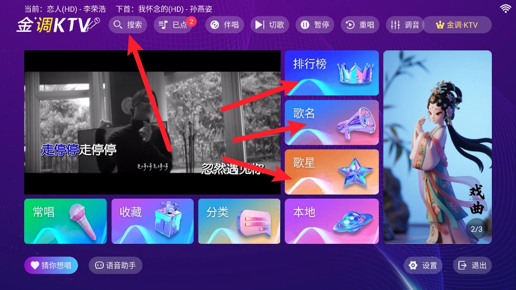 2、进入主页后,可通过搜索功能点歌,也能借助排行榜,或是直接搜索歌星、歌名来实现点歌操作。