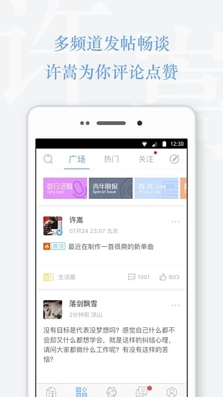 3、圈子广场设有多个频道,用户可在此发帖,与许嵩及其他用户进行互动,也能点击“关注”按钮,查看所关注用户的最新动态。