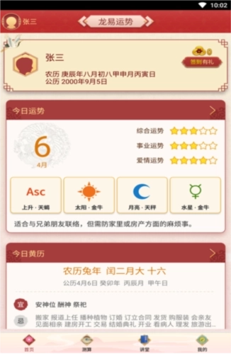 龙易运势的新版本是一款适用于Android系统的手机算命应用,它整合了周易、五行、八字、姓名笔画、三才五格、五行数理等多种传统命理元素进行开发。这款免费版本具备个人运势查询、个人命理分析、姓名测试、姓名匹配、爱情桃花测算、周公解梦解读、号码吉凶评估、手摇占卜以及黄道吉日查询等丰富功能,能够助力用户通过测字算命等方式,更深入地认识自身的命运走向。