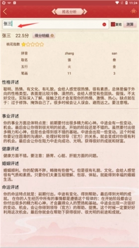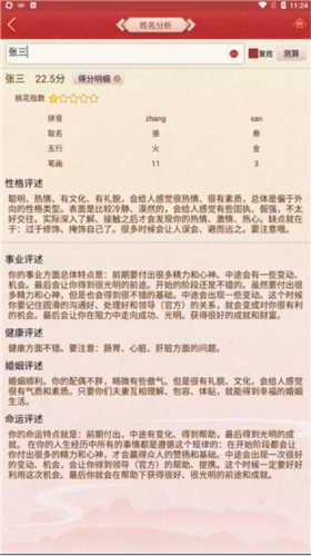 -姓名测试打分:依据传统姓名学的五行数理,对名字所蕴含的总体运势展开评述。