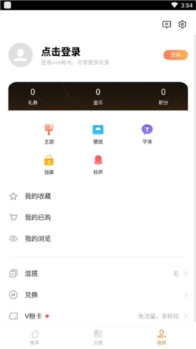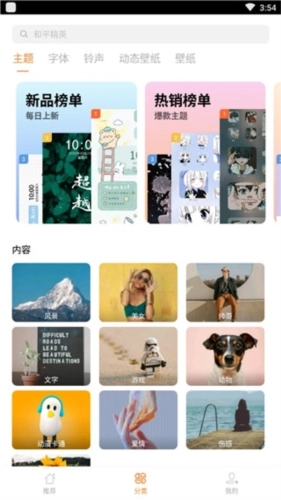 4、点击“分类”按钮,即可按分类浏览内容。除了主题资源外,还能查看字体、铃声、动态壁纸等其他类型的资源。