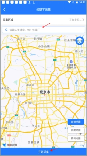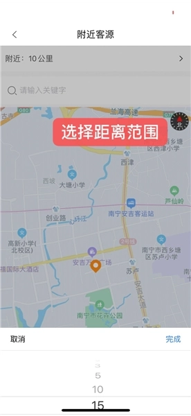 打开【附近客源】功能,接着设置好查询范围,再输入找到的关键信息,最后点击开始查询按钮。