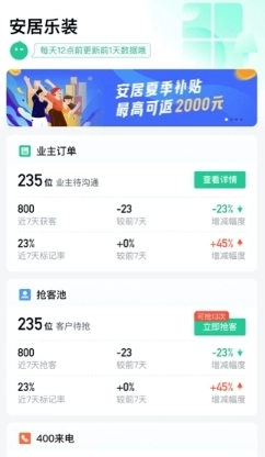 安居乐装是安居客为装修商家量身打造的移动工具,旨在提升连接效率,为装修、建材商家赋能。借助“安选装修平台”管理系统,装修、建材商家可在安居客开放平台开设网络店铺,发布案例、产品、促销活动及市场动态。此外,安居客还提供商家专属的便捷功能,助力装修、建材商家与安居客平台上的海量装修业主进行有效互动,从而切实推动线下交易的达成。