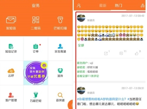 进入首页后,呈现的便是功能页面,其中包含二维码扫码下单、客户管理、快递查询、订单管理、驿站、巴枪等多项功能。