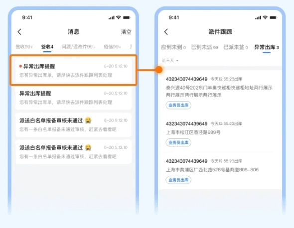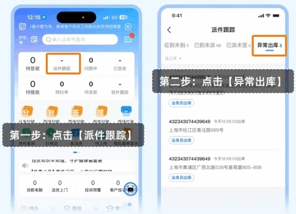 点击【派件跟踪】,点击查看【异常出库】列表;