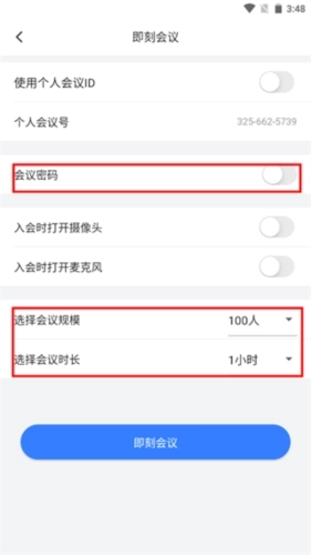 2、可以设置即刻会议的密码以及会议规模,设置完成后点击,“即刻会议”,将会议密码或者个人会议号发给需要参与会议的人员即可